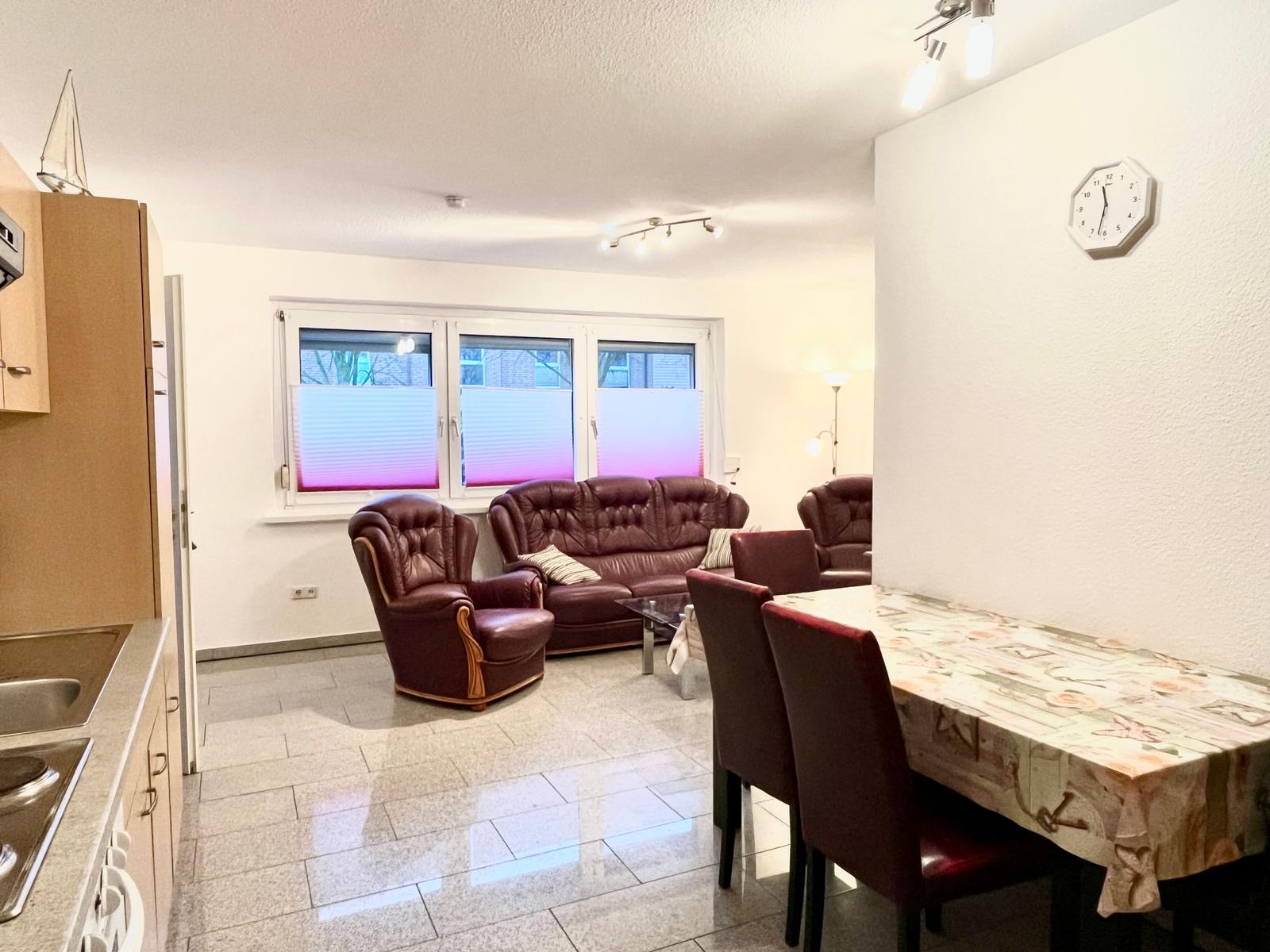 Die Wohnzimmer sind mit einer gemühtlichen Wohnlandschaft in Leder ausgestattet und verfügen über WLAN, einen Fernseher mit Sat-Anschluss und ein Radio mit CD-Player. Unsere Wohnung hat zwei Schlafzimmer.