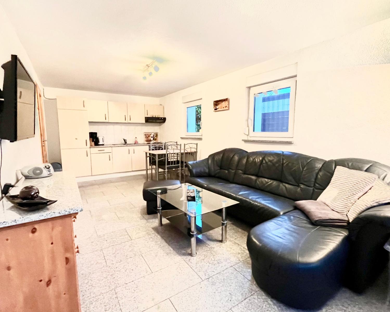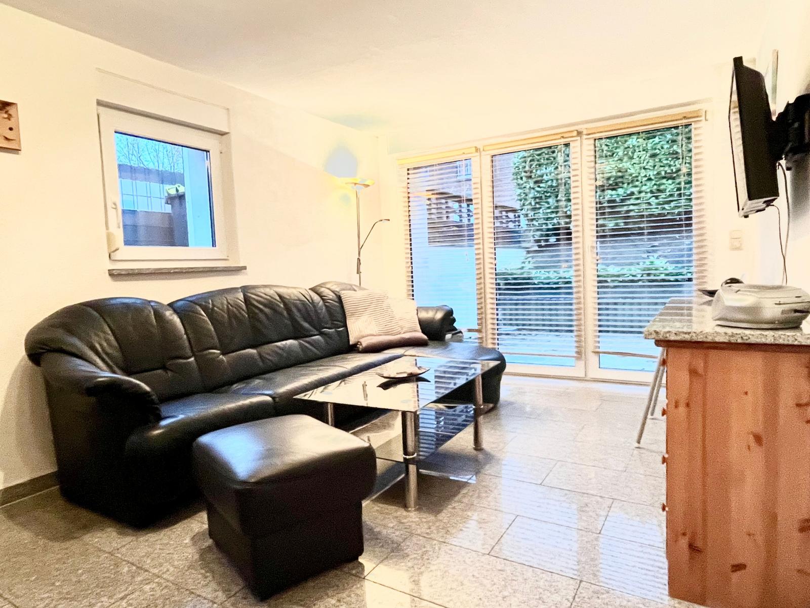 Der Wohnbereich ist offen gestaltet, die Sofagarnitur als Ecksofa, ein Fernseher, WLAN und ein CD-Radio, so dass für mediale Unterhaltung gesorgt ist. Durch die großen Fenster und den Zugang zum Außenbereich zur Terrasse ist der Raum besonders hell.